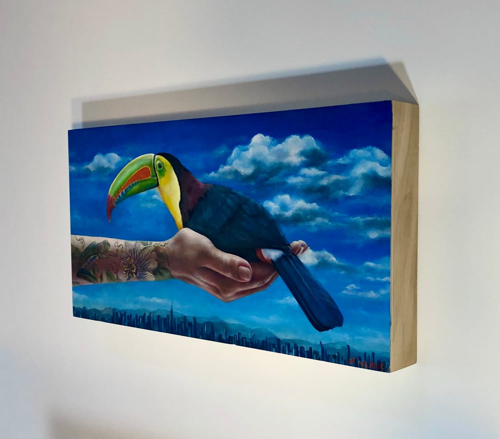 "Deep Breath" Oil on cradled wood board, 8 x 16", the third painting in my Avos Sapien series. The beautiful toucan being held above a clear Mexico City skyline, a dream of how things could be if we can learn to live in harmony with nature and end pollution. The tattoos speak of the delicate balance of life in the toucan's natural habitat.
