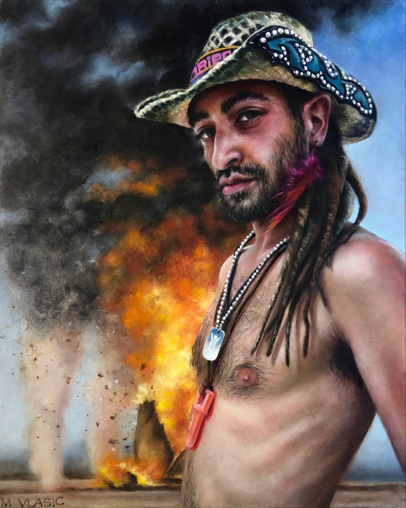 I met this lovely gentleman at the "Bubbles and Bass" camp on the Esplanade at Burning Man right after the dawn Embrace burn in 2014 . It seemed appropriate to place him in front of that burn for this portrait. I have well over 40 hours in this detailed little painting. Please feel free to ask any questions you may have. Thanks for looking!
