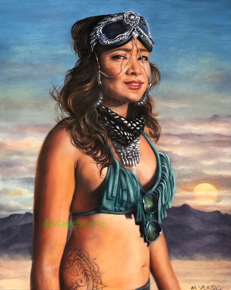 I have about 35 hours into this little painting. I met this lovely lady at Burning Man in 2014, and that smile just grabbed me, sweet, sly and knowing all at the same time. I knew I had to paint her.