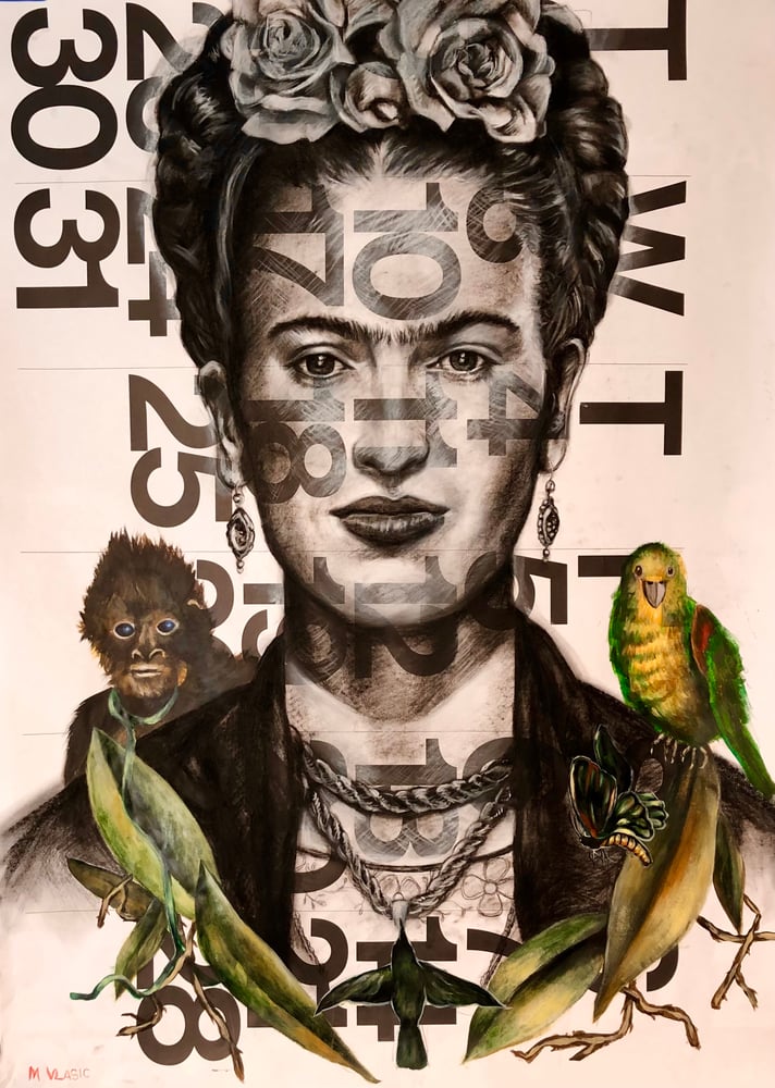 NEW RELEASE Frida Kahlo Original Charcoal Drawing on Stendig Calendar Paper by M Vlasic