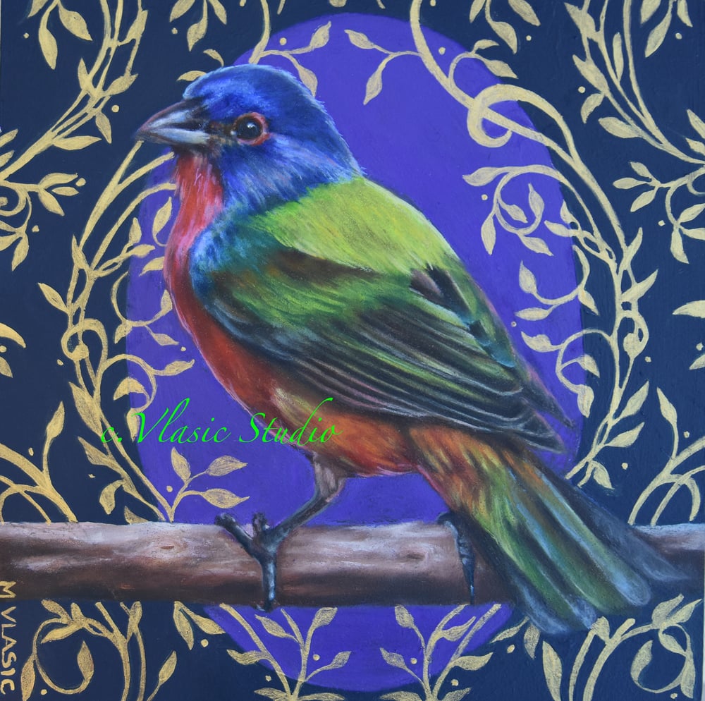 "Painted Bunting" is an original one of a kind oil painting by professional artist Marie Vlasic, part of a new series featuring birds and birds with the human figure. This painting is 6 x 6", oil on cradled wood board, and is ready to hang (no frame needed).